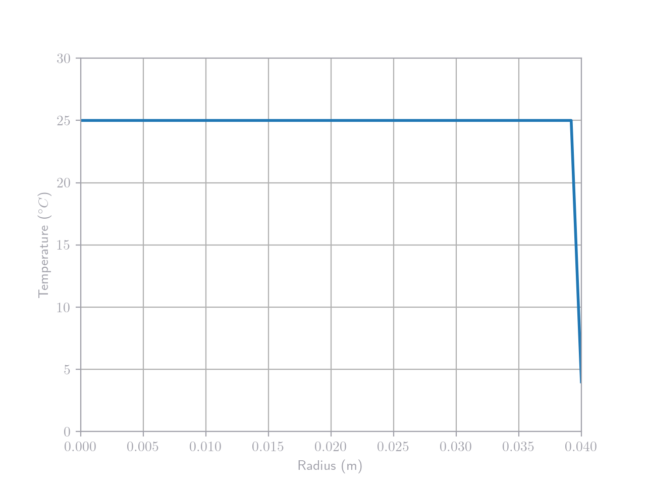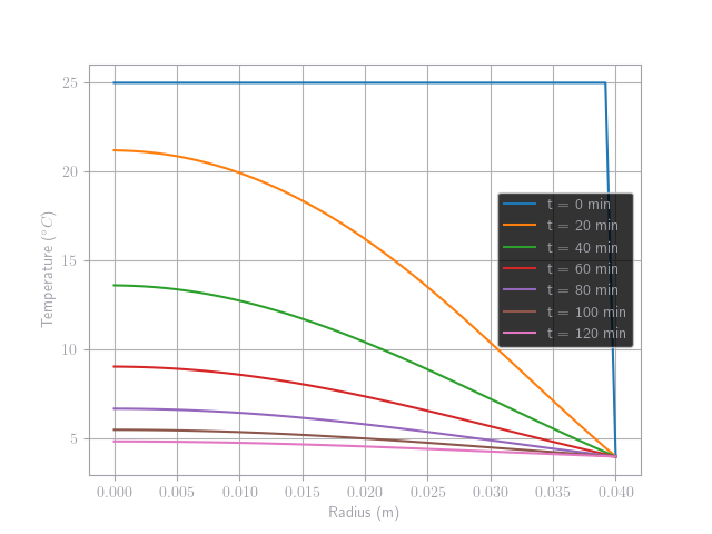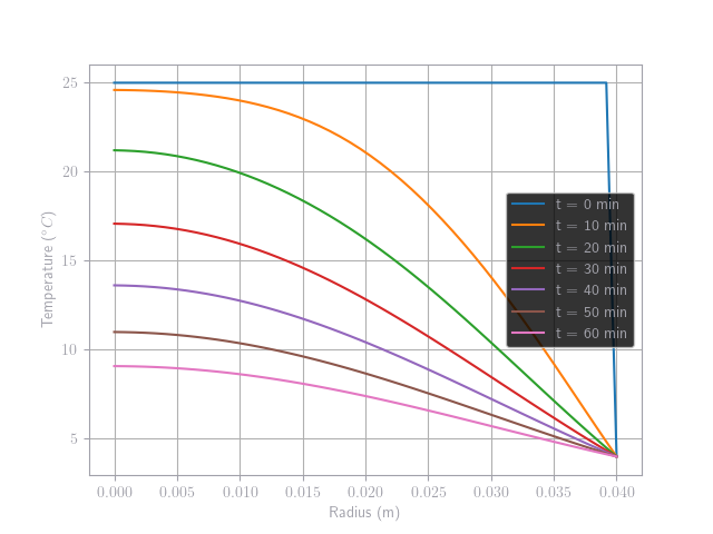 As we can see, the temperature is gradually getting closer and closer to the the fridge temperature. I will consider the drink cooled down when the centre of the drink has also reached . Currently, even after 1 hour, the centre of the drink is still at around . This means we need to leave it in the fridge for longer. Let’s run the solver for 2 hours now and see what happens: